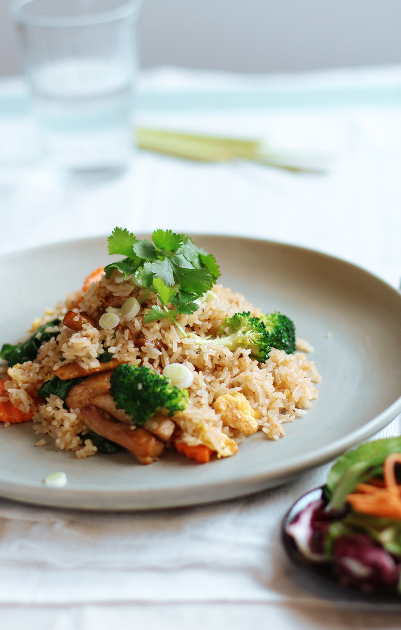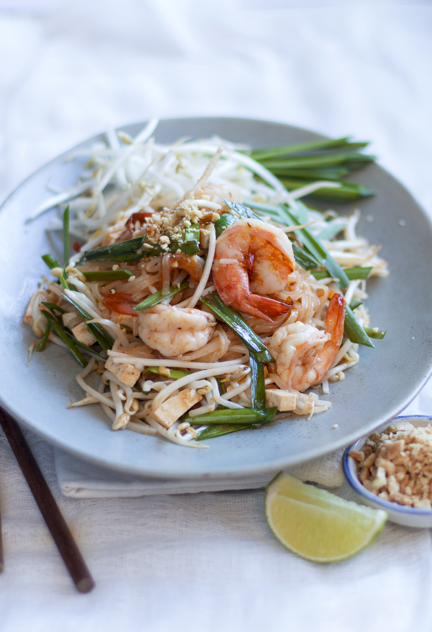 Stir-fried rice noodles in tamarind sauce with your meat choice ( chicken or shrimp ), tofu, egg, bean sprouts, chives and ground peanuts.